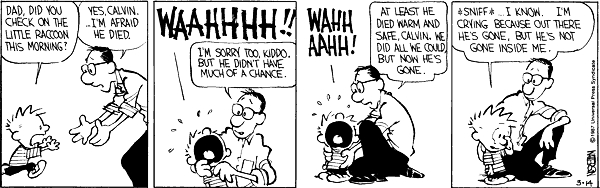 Below are a series of cartoons from Calvin and Hobbes about a baby raccoon. There are so many touching and thought panels in such a short story. It is a wonderful series.
